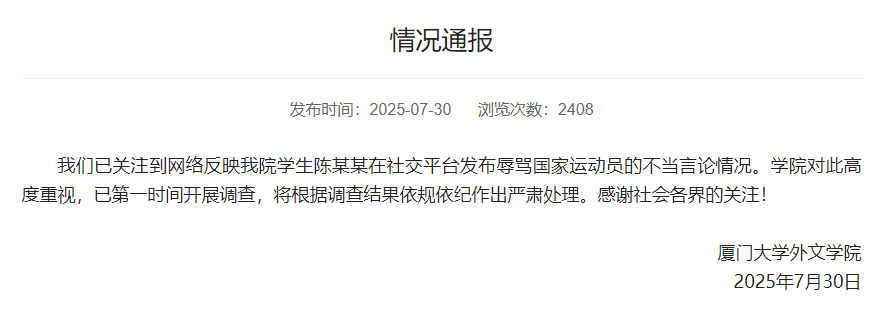 我们已关注到网络反映我院学生陈某某在社交平台发布辱骂国家运动员的不当言论情况。学院对此高度重视,已第一时间开展调查,将根据调查结果依规依纪作出严肃处理。感谢社会各界的关注!