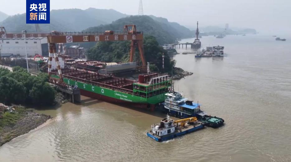 日前,由江西造船企业建造的“740标箱纯电动敞口集装箱船”在江西九江湖口成功下水。
