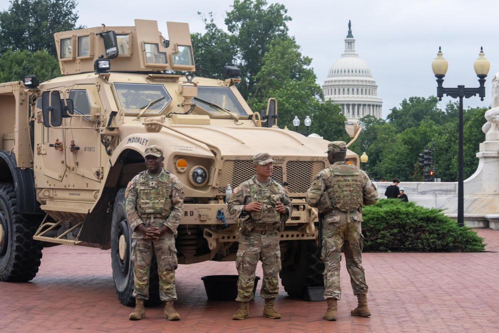 这是8月19日在美国首都华盛顿的联合车站外拍摄的国民警卫队成员和车辆。新华社记者胡友松摄
