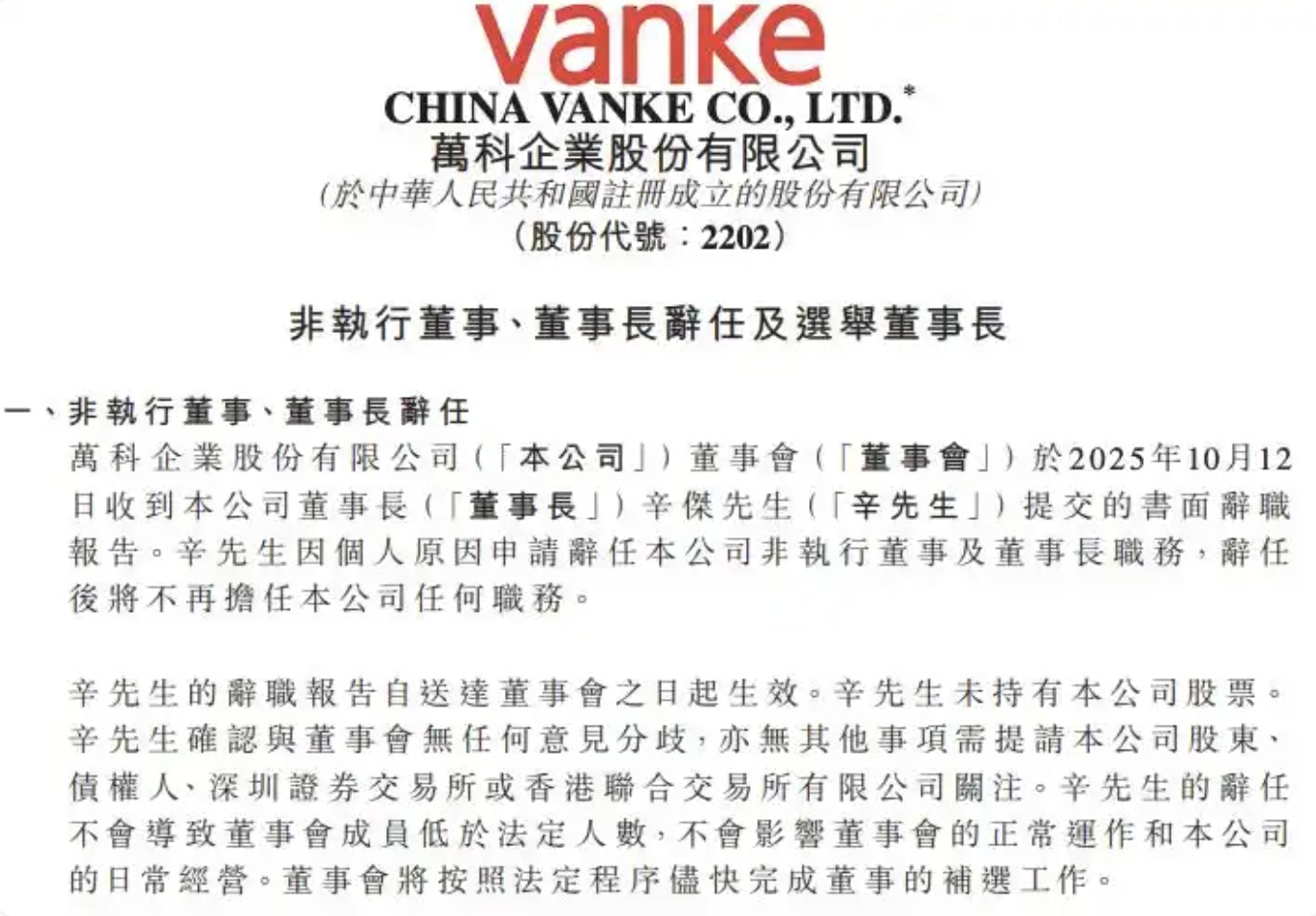 房地产企业万科,一年内第二次更换董事长。10月13日,万科在港交所公告称,公司董事会于2025年10月12日收到董事长辛杰提交的书面辞职报告。辛杰因个人原因申请辞任公司非执行董事及董事长职务,辞任后将不再担任公司任何职务。“万科董事长辛杰辞职”话题登上热搜。