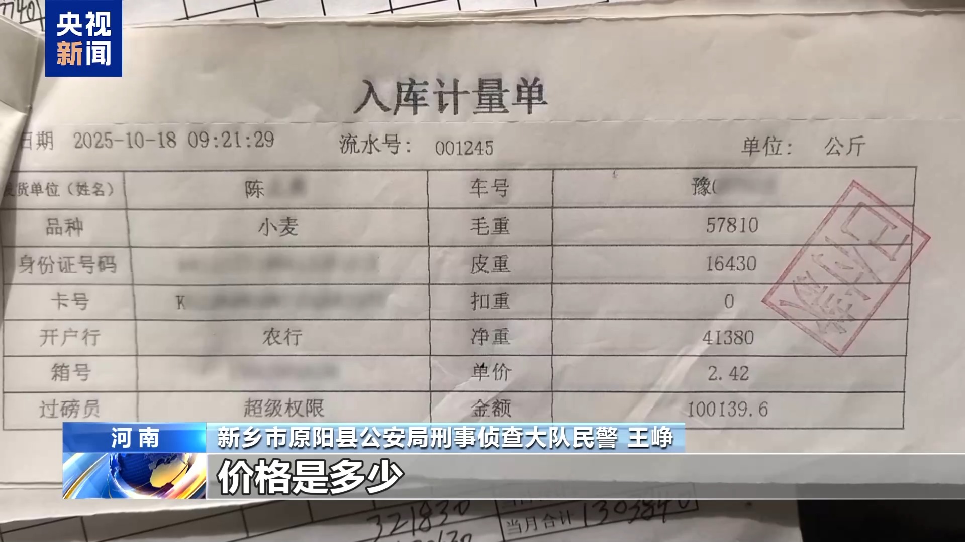 新乡市原阳县公安局刑事侦查大队民警 王峥:当时粮站的负责人跟我们讲,一陈姓男子向该粮站售卖小麦,这三车都是他带着过来了。他还详细给我们提供了当时货车的车牌号,到粮站的时间,包括每车有多少吨小麦,价格是多少。