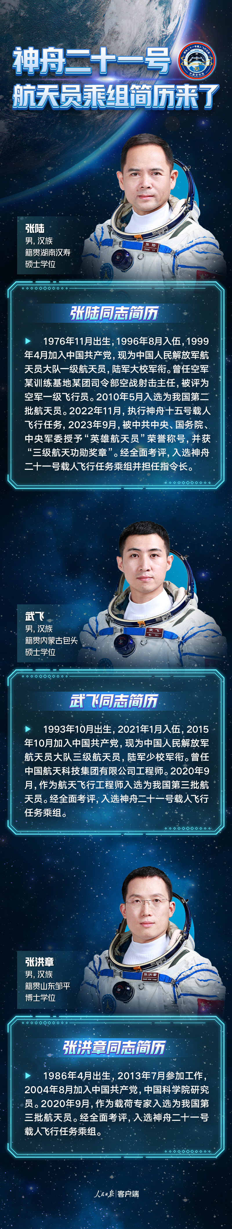经研究决定,瞄准北京时间10月31日23时44分发射神舟二十一号载人飞船,飞行乘组由张陆、武飞、张洪章组成,张陆担任指令长,3名航天员分别为航天驾驶员、飞行工程师和载荷专家,涵盖了我国现役3种航天员类型。航天员张陆执行过神舟十五号载人飞行任务,武飞和张洪章均来自我国第三批航天员,是首次执行飞行任务。其中,武飞入选前是中国航天科技集团有限公司空间技术研究院工程师,张洪章入选前是中国科学院大连化学物理研究所研究员。
