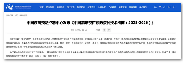 11月3日,中国疾病预防控制中心发布《中国流感疫苗预防接种技术指南(2025-2026)》(以下简称“指南”)。