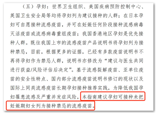 因此,为降低我国孕妇罹患流感及严重并发症风险,指南建议孕妇可接种未把妊娠期妇女列为接种禁忌的流感疫苗。