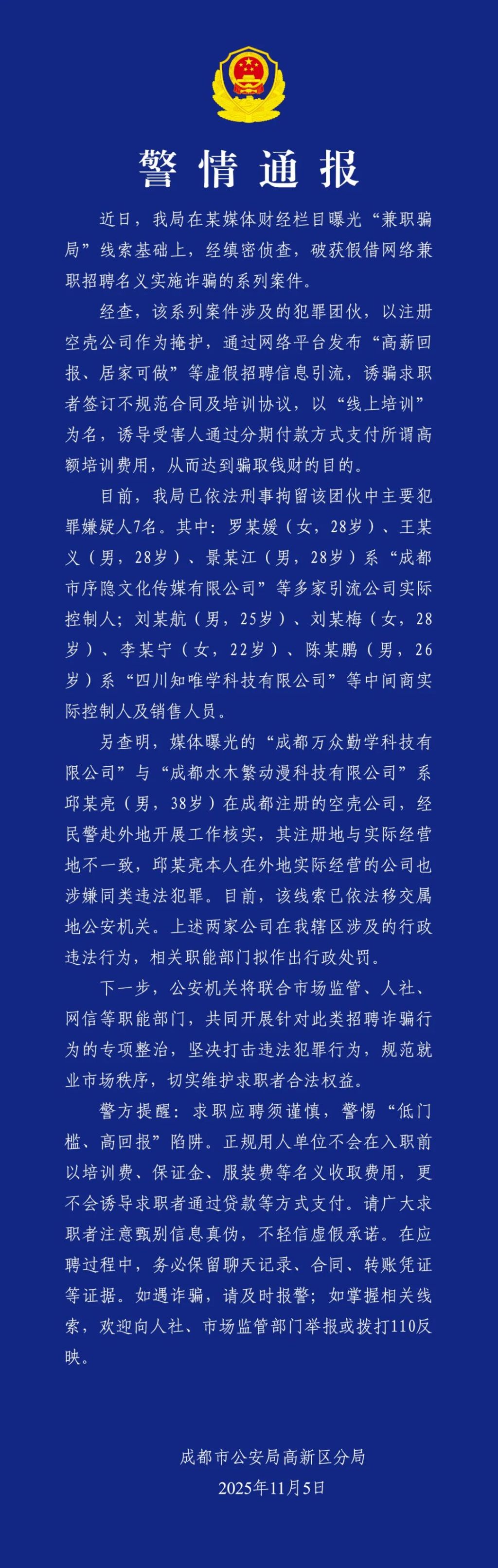 成都警方:网络兼职招聘诈骗案告破,7人被刑拘