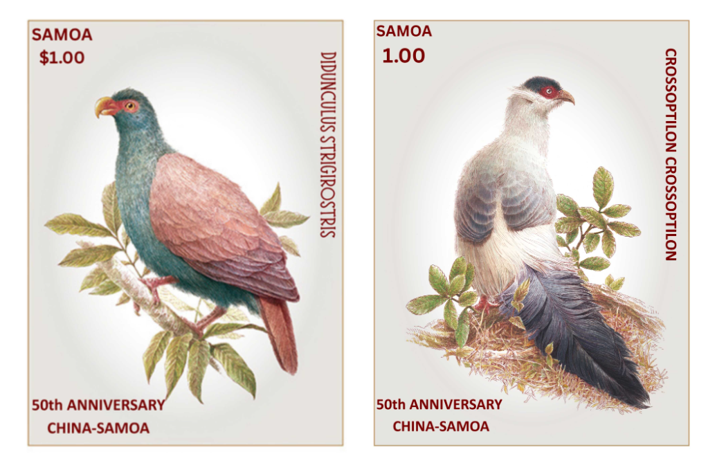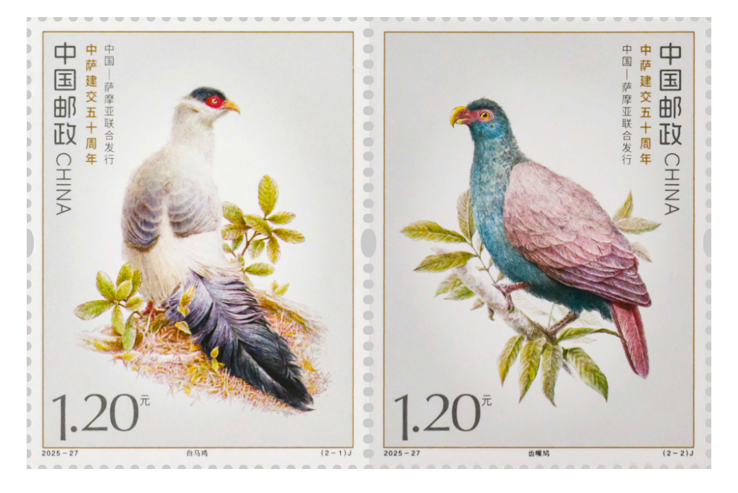 邮票主体分别为中国四川丹巴县“白马鸡”和萨摩亚国鸟“齿嘴鸠”,展现了两国独特的自然生态之美,传递出了中萨人民深厚的友谊。