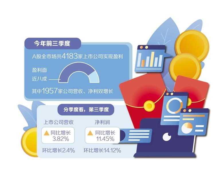 业内人士表示,稳定分红是检验上市公司经营质量的试金石,当前上市公司回报股东的意愿强烈,其稳健的经营业绩、回升的盈利能力是核心支撑。今年前三季度,A股全市场共4183家上市公司实现盈利,盈利面近八成,其中1957家公司营收、净利双增长。分季度看,第三季度上市公司营收、净利润同比增长3.82%、11.45%,环比增长2.4%、14.12%,逐季向好态势继续巩固。