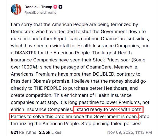 △11月9日,美国总统特朗普再次在社交媒体上发帖,批评民主党人的医保政策,并坚持其先重开政府,再与民主党人讨论医保问题的立场。