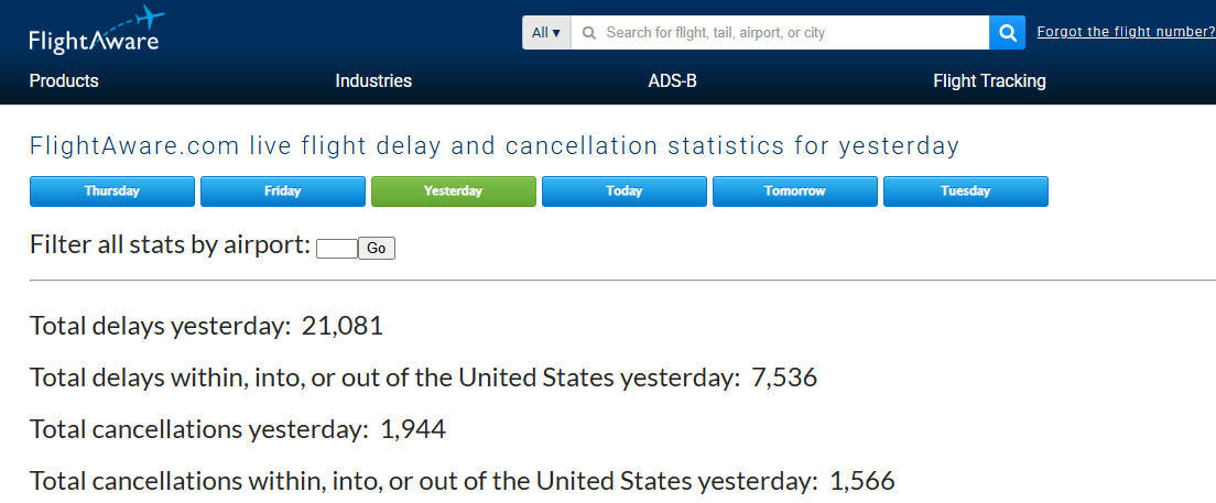 △美国航班跟踪网站(Flightaware)统计的8日全天美国延误及取消航班数据。