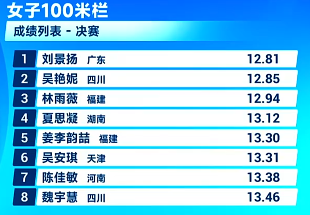 刚刚,十五运会田径项目女子100米栏决赛,刘景扬反超以12秒81夺冠,创造个人最好成绩,吴艳妮以12秒85创造赛季最好成绩获得银牌,林雨薇以12秒94赛季最好成绩摘得铜牌。