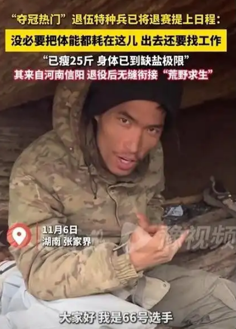 经过一段时间的比赛,选手们无不出现形容枯槁、蓬头垢面、衣着褴褛的状态,甚至出现营养不良的情况。来自河南信阳的退役特种兵王昌繁,赛前被看作夺冠热门,但在11月7日正式离场。截至退赛前,他29天瘦了25斤,身体已经到了缺盐极限。