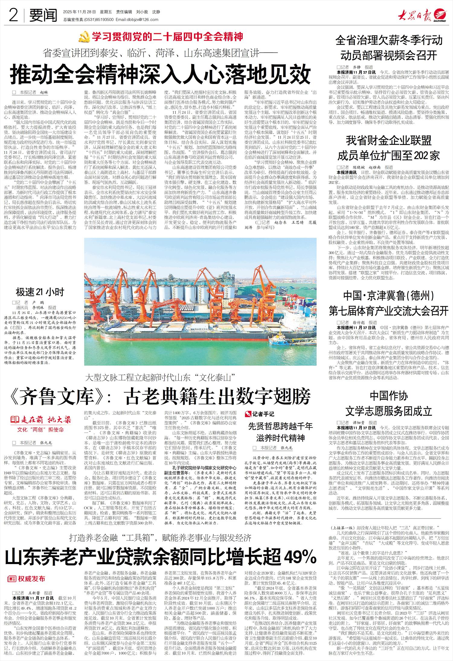 大型文脉工程《齐鲁文库》分典籍、研究、史志、人物、文物、文学艺术、山水、科技、红色文献九编,约13亿字,全面研究、保护、辑录和整理出版山东历代传世文献,并逐步扩展至山东现代文化研究出版,成为齐鲁文化最丰富、最完备的集大成之作,立起新时代山东“文化泰山”。