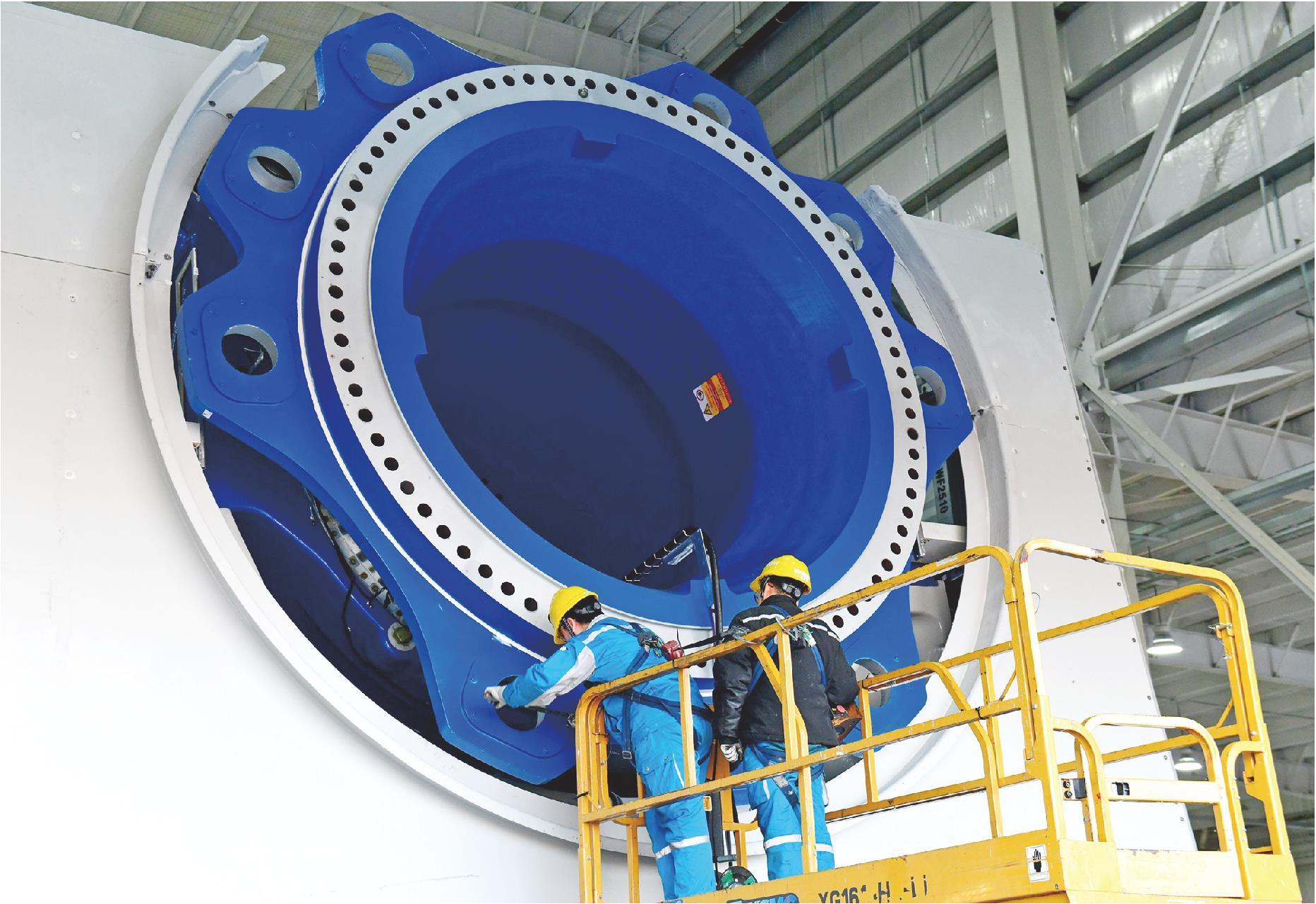 11月21日,在乳山市远景零碳绿色能源装备产业园,工作人员装配风电主机。