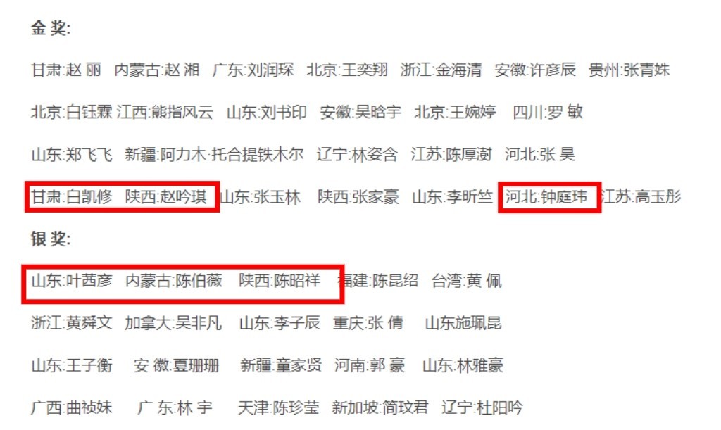 记者注意到,在上述名单金奖获得者中出现了《10000中国普通人名大全》中的白凯修、赵吟琪、钟庭玮,银奖名单中出现了叶茜彦、陈伯薇、陈昭祥。他们分别标注来自甘肃、陕西、河北、山东、内蒙古、陕西。