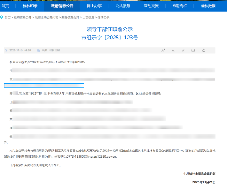 今年11月24日,广西桂林当地媒体发布了一则《领导干部任职前公示》,发布单位是桂林市委组织部,落款时间为2025年11月21日。