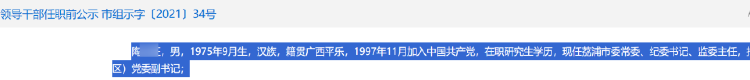 记者查询发现,桂林市委组织部2021年7月7日发布的《领导干部任职前公示》显示,陶某某的出生年月是1975年9月,当时他是“现任荔浦市委常委、纪委书记、监委主任,拟任县(市、区)党委副书记;”此外,在桂林市委组织部2017年11月13日发布的《领导干部任职前公示》信息中,陶某某的出生年月也是1975年9月,当时他是“现任荔浦县人民政府副县长,拟任县(区)党委常委。”