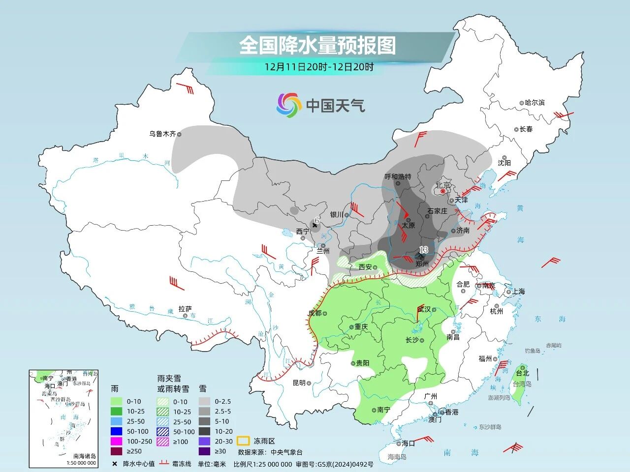 12日,将是本轮雨雪影响范围最广、强度最强的时段。雨雪分界线大致在河南南部、山东南部一带,届时,山西、河北、河南将成为强降雪中心,局地有大雪,河南中北部等地部分地区或现暴雪。