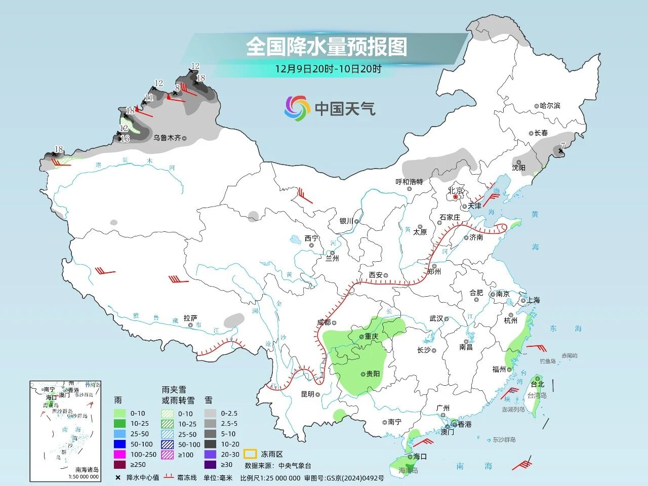 11日,雨雪区域随着寒潮继续东移南下,新疆北部和东部、甘肃北部、东北地区东南部等地部分地区有小雪或雨夹雪,其中,新疆沿天山地区和东部等地部分地区有中到大雪,局地暴雪。