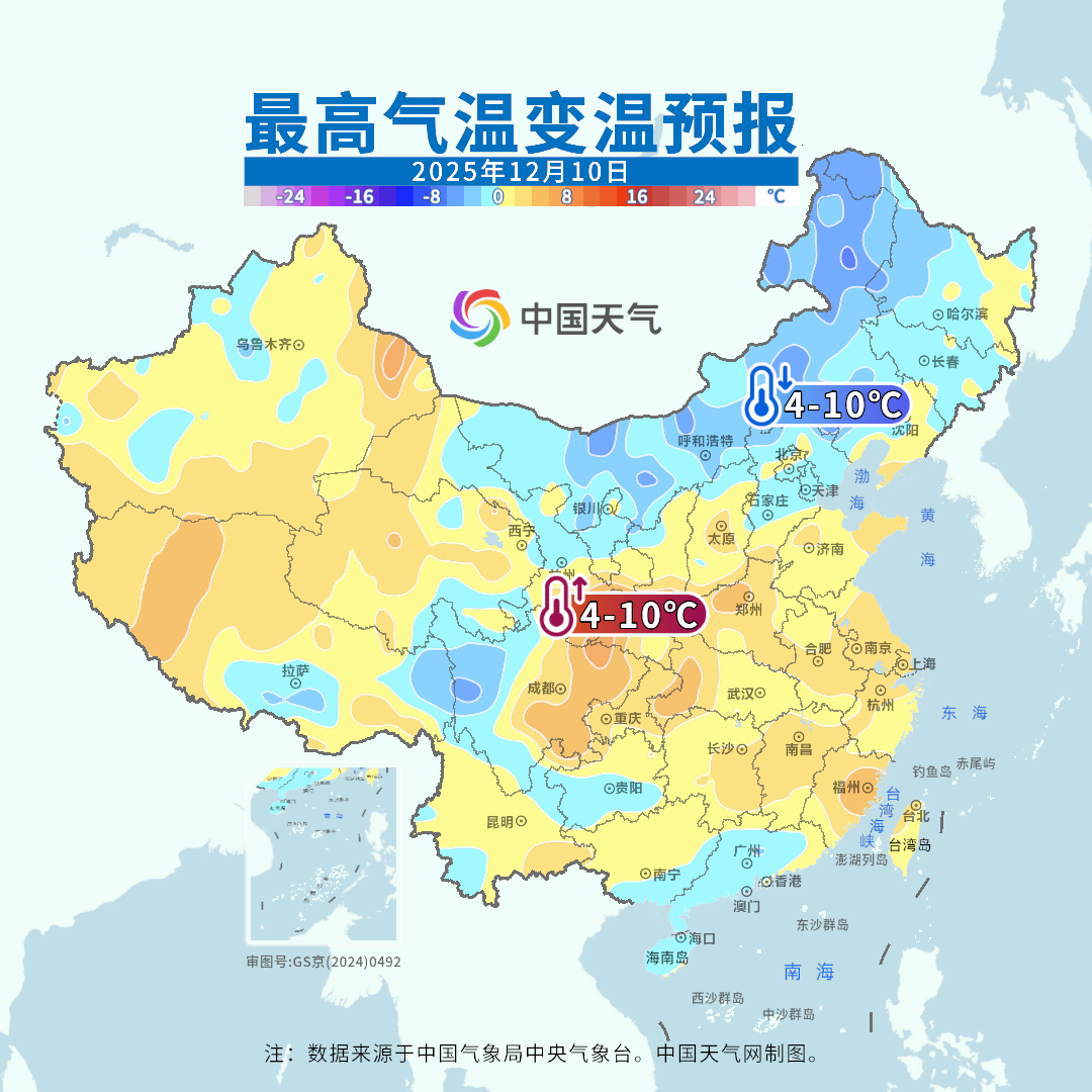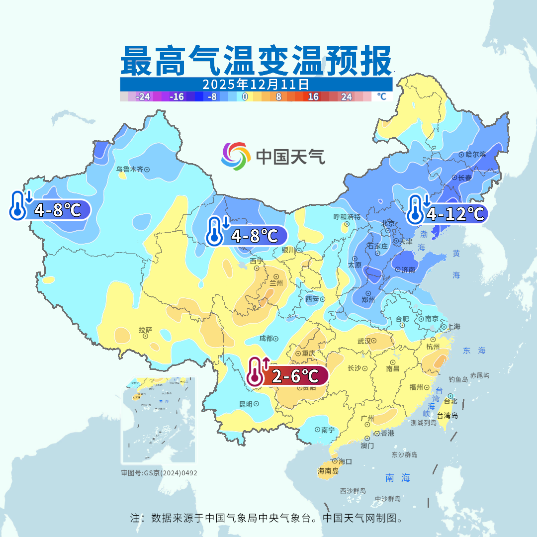 但大家别被眼前的温暖“欺骗”了!随着寒潮推进,气温将自北向南明显下降,温暖一扫而空。北方降温主要是在11日至12日,南方主要集中在12日至13日,届时最低气温0℃线将南压至长江流域一带。
