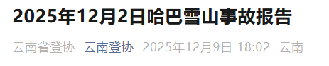据“云南登协”微信公众号消息,2025年12月2日,云南省迪庆藏族自治州香格里拉市东南部的哈巴雪山发生一起登山事故。湖南籍男子胡某在雪山全面封山期间,违规从西坡进山,最终在海拔5050米处不幸滑坠失联。