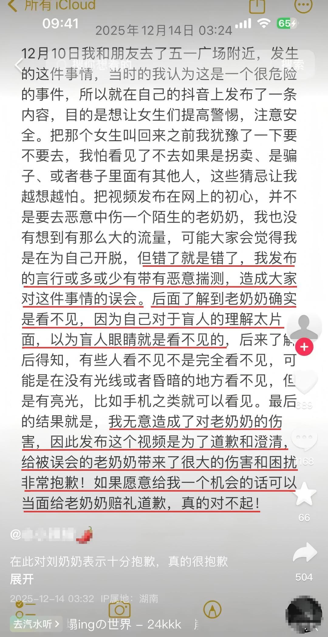 12月14日凌晨,原博主账号发布道歉视频,称自己此前发布提醒的目的是想让女性提高安全警惕,因发布的言行或多或少带有恶意揣测,造成大家对这件事情的误会。给刘奶奶带来了伤害和困扰,对此深感抱歉,并愿意当面赔礼道歉。
