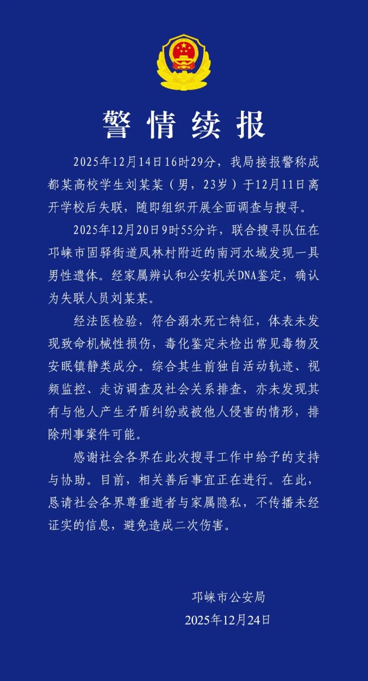 2025年12月14日16时29分,邛崃市公安局接报警称成都某高校学生刘某某(男,23岁)于12月11日离开学校后失联,随即组织开展全面调查与搜寻。