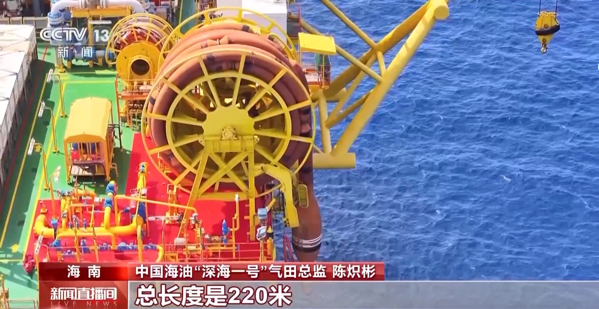 中国海油“深海一号”气田总监 陈炽彬:这个是“深海一号”的凝析油外输软管,总长度是220米,每次凝析油外输作业最大量将近1.5万吨,大约12天左右,我们就会进行一次凝析油的外输作业。
