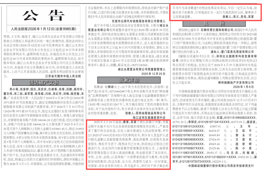 2026年1月12日,《人民法院报》2版刊登了海底捞“小便门”当事人吴某及其父母的致歉声明。此前的1月8日,另一当事人唐某及其父母也已登报致歉。