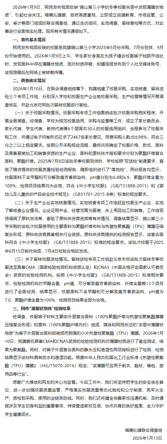2026年1月9日,网民发布视频反映“锦山第三小学的冬季校服夹层中发现薄膜状物质”,引起社会关注。喀喇沁旗委、政府高度重视,立即成立由旗教育、市场监管、公安、审计等部门组成的联合调查组,通过走访询问、实地调查、留样复检等方式,对此事进行全面核实处理。现将有关情况通报如下。