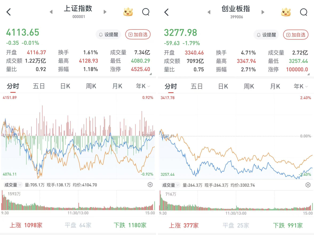 至收盘,上证综指跌0.01%,报4113.65点;科创50指数跌1.58%,报1482.99点;深证成指跌0.97%,报14155.63点;创业板指跌1.79%,报3277.98点。