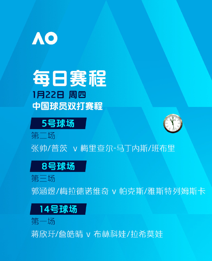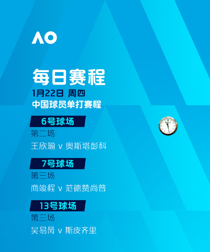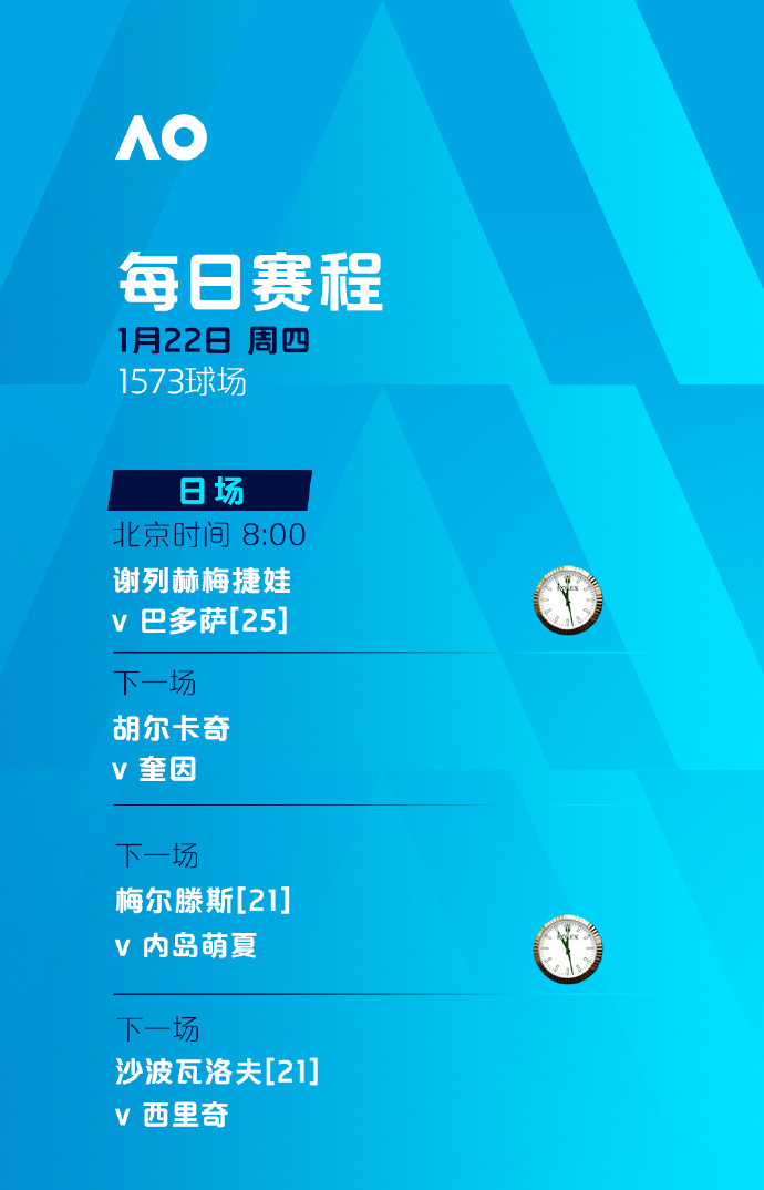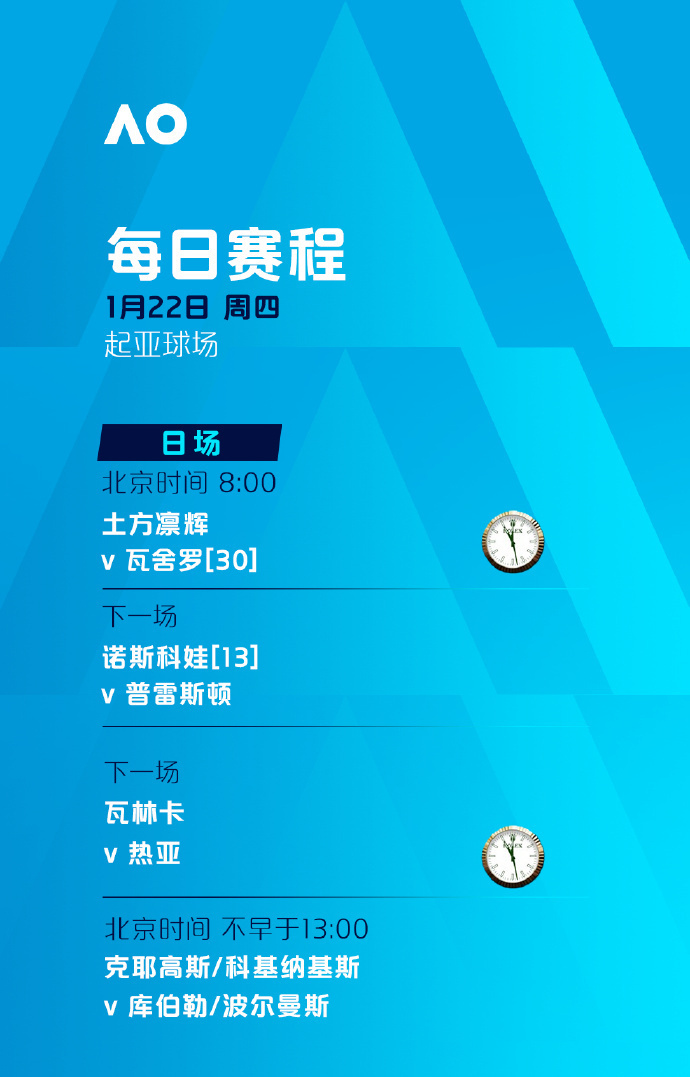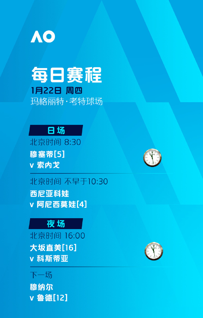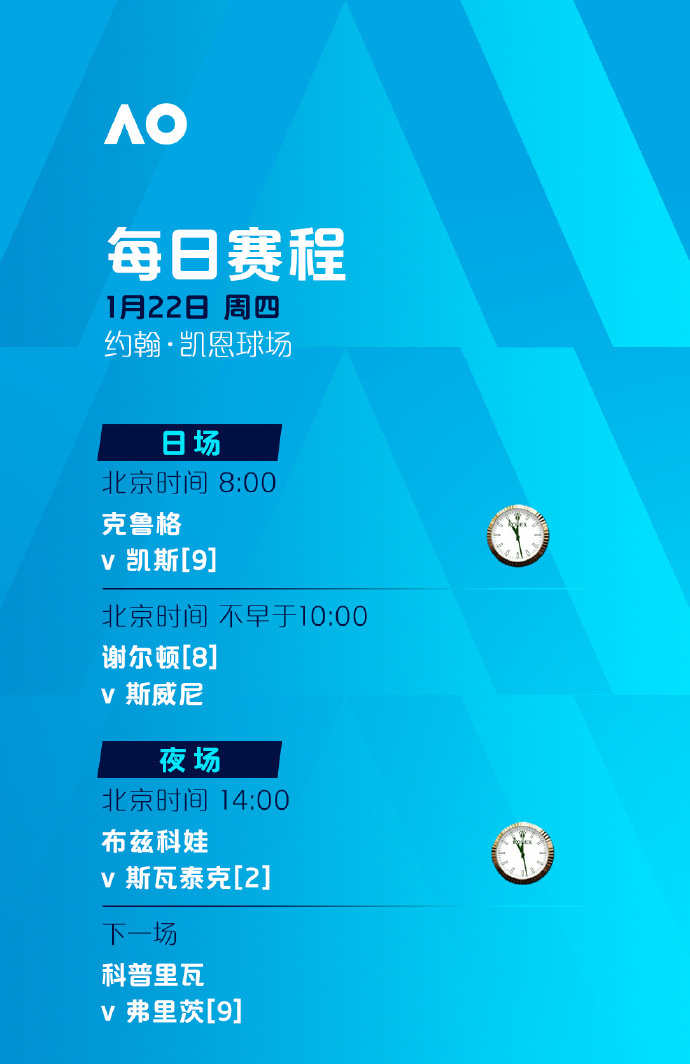 比赛时间:罗德·拉沃尔球场、玛格丽特·考特球场将从北京时间8:30开打,其余球场将从北京时间8:00开打。