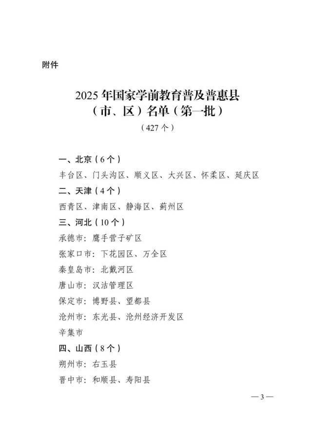近日,教育部印发通知,公布2025年国家学前教育普及普惠县(市、区)名单。2025年第一批认定427个县(市、区)为国家学前教育普及普惠县。其中,天津、上海两个直辖市全域通过国家评估认定;内蒙古乌海市,江苏省无锡市、镇江市,浙江省杭州市、嘉兴市、金华市、丽水市、舟山市,山东省滨州市,海南省三沙市,四川省宜宾市,贵州省铜仁市,甘肃省嘉峪关市,新疆维吾尔自治区克拉玛依市、昌吉回族自治州、哈密市等16个市(州)全域通过国家评估认定。具体名单,一起来看——