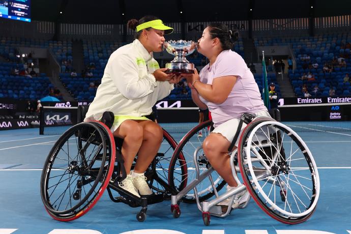 北京时间1月30日,2026澳网轮椅网球女双决赛,头号种子、中国组合王紫莹/李晓辉以6-4、6-3击败2号种子朱珍珍/上地结衣,实现卫冕。中国选手朱珍珍和搭档上地结衣收获亚军。