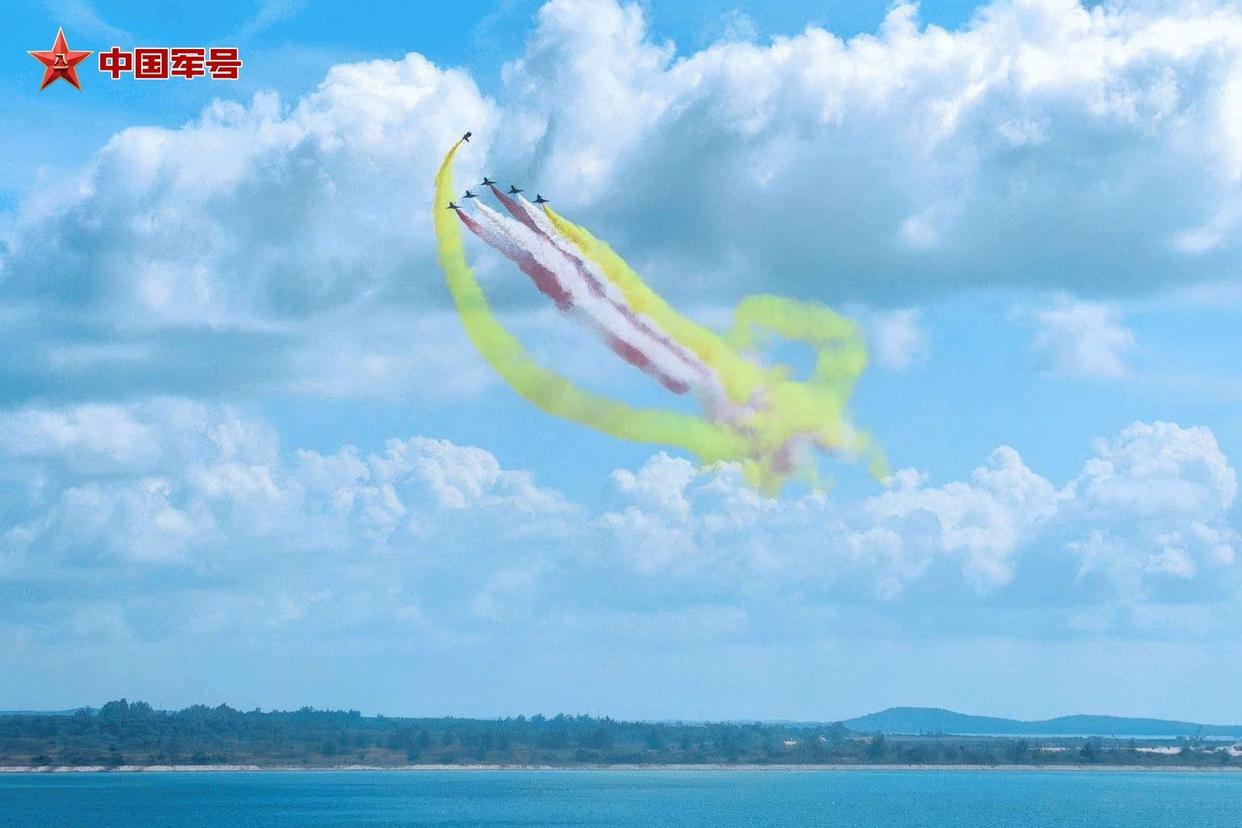 碧海蓝天之间,战鹰诗意起舞。抵达表演空域后,6架歼-10表演机率先进行六机超密集编队通场,拉出象征中新两国国旗颜色的红、黄、白三色彩烟低空掠过海面,六道彩色航迹犹如彩虹一般,勾勒出优美多姿的轨迹。随后,五机、四机、双机、单机等特技动作有序衔接,编队整齐划一、动作流畅紧密。