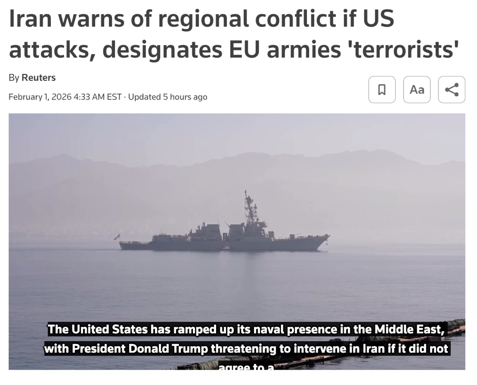 另一方面,伊朗国内局势与外部压力相互叠加,最高领袖哈梅内伊2月1日首次用“地区战争”做公开警示,称如果美国对伊朗发动攻击,将会引发地区战争,这无疑是把风险上限直接抬高,既是对美方军事选项的吓阻,也是向地区国家和能源市场发出的信号——任何误判都可能造成难以估量的影响,甚至连霍尔木兹海峡是否出现实弹演训、是否影响航运预期,都能迅速成为舆情与市场的神经末梢。