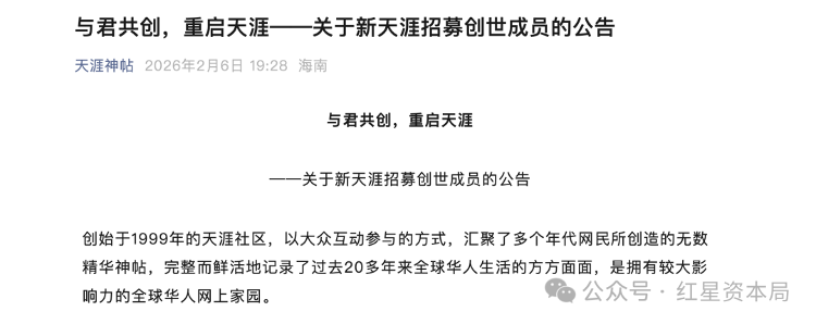 为确保承载着亿万网民青春记忆、原创内容和人生梦想的数据完整存续,并推进天涯社区于2026年6月1日恢复访问,天涯客公司与热心天涯重启的团队组成联合工作组,在征得天涯社区公司认可的基础上,现推出“新天涯创世成员产品服务包”,招募创世成员,成为新天涯的共建者与天涯社区重启者,共同重构全球华人的精神原乡。