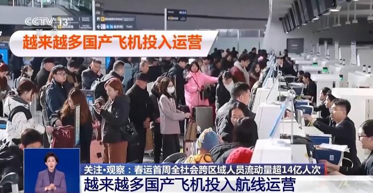 民航方面,今年春运,越来越多国产飞机投入航线运营。以南航为例,今年春运,南航首次开启C919客机广州、长沙双基地运行,C919客机将在8条航线执行超1000个航班。