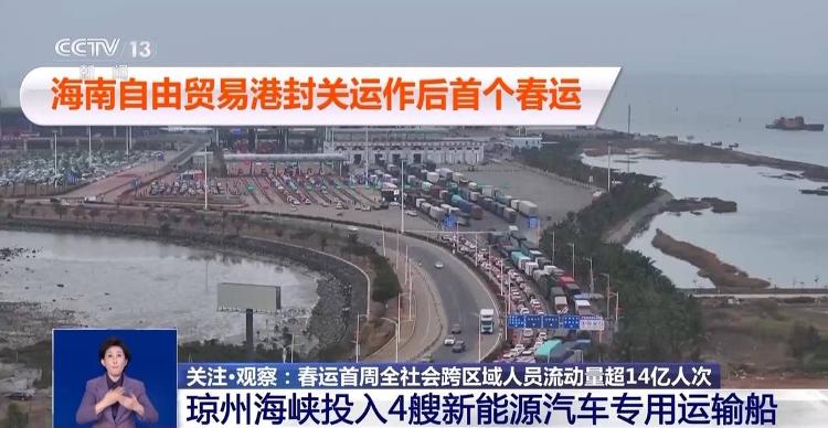 海南省交通运输厅有关负责人介绍,琼州海峡投入4艘新能源汽车专用运输船,采用“人车分装”模式,单船单次可运输160辆新能源汽车,每日设置50个新能源车运输专班,日均保障能力达5000台次。