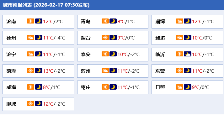 夜间最低气温:济南和淄博6℃左右,泰安和半岛内陆地区0℃左右,其他地区2℃左右。