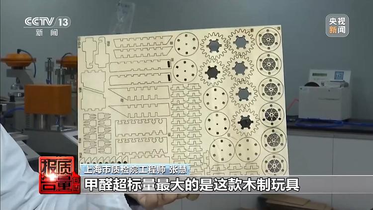 上海市质检院工程师 张慧:中国玩协一共送样66批次,有9批次不符合新国标的要求。甲醛超标量最大的是这款木质玩具,超限量值33倍多。一款电动毛绒玩具TVOC释放量是很高的,超新国标限量值大概7倍多。