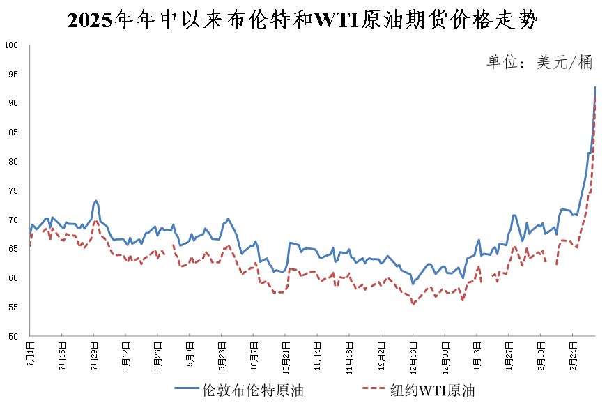 调价周期内,美国和以色列对伊朗发动袭击,伊朗革命卫队宣称将袭击通过霍尔木兹海峡的船只,并对沙特、卡塔尔等国能源设施发起报复性打击。作为全球最重要的石油运输咽喉,霍尔木兹海峡航运陷入实际中断,一度导致超3000艘船只滞留波斯湾港口,油轮运费升至创纪录水平。随着冲突深入,供应中断从运输端蔓延至生产端。伊拉克、阿联酋、科威特因出口受阻和储存空间耗尽开始削减石油产量,其中,伊拉克减产近150万桶/日;沙特阿拉伯因受无人机袭击关闭其最大炼油厂,卡塔尔也暂停了全球最大液化天然气出口厂的生产。周期末期,伊朗发动大规模导弹攻势,并宣称摧毁美国部署在海湾国家的雷达系统,战火从海上运输线蔓延至陆上军事目标,局势进一步扩大。受此影响,国际油价在短时间内接连突破每桶80美元、90美元关口,截至3月6日,伦敦布伦特、纽约WTI原油期货价格收盘分别为每桶93美元和91美元。3月9日开盘,两市油价突破每桶100美元。