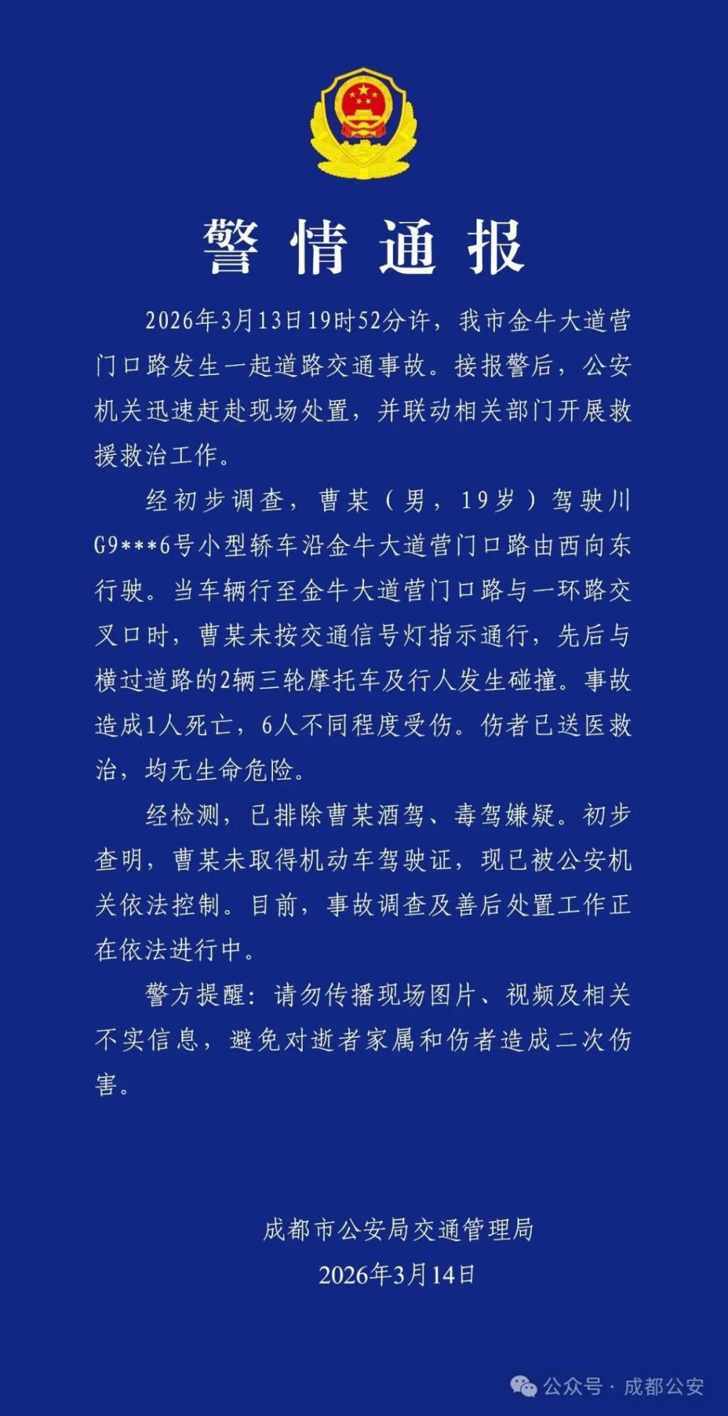 2026年3月14日,成都市公安局交通管理局发布警情通报: