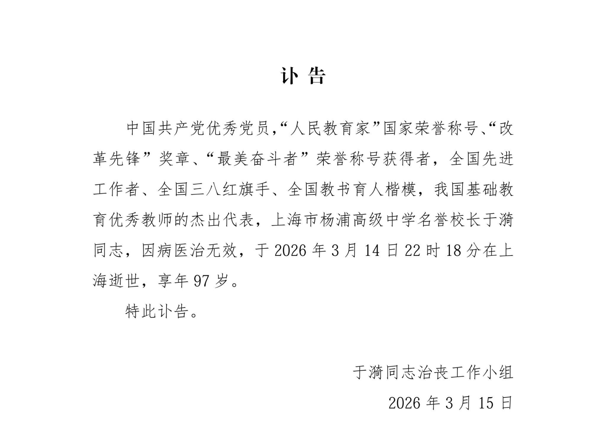 中国共产党优秀党员,“人民教育家”国家荣誉称号、“改革先锋”奖章、“最美奋斗者”荣誉称号获得者,全国先进工作者、全国三八红旗手、全国教书育人楷模,我国基础教育优秀教师的杰出代表,上海市杨浦高级中学名誉校长于漪同志,因病医治无效,于2026年3月14日22时18分在上海逝世,享年97岁。