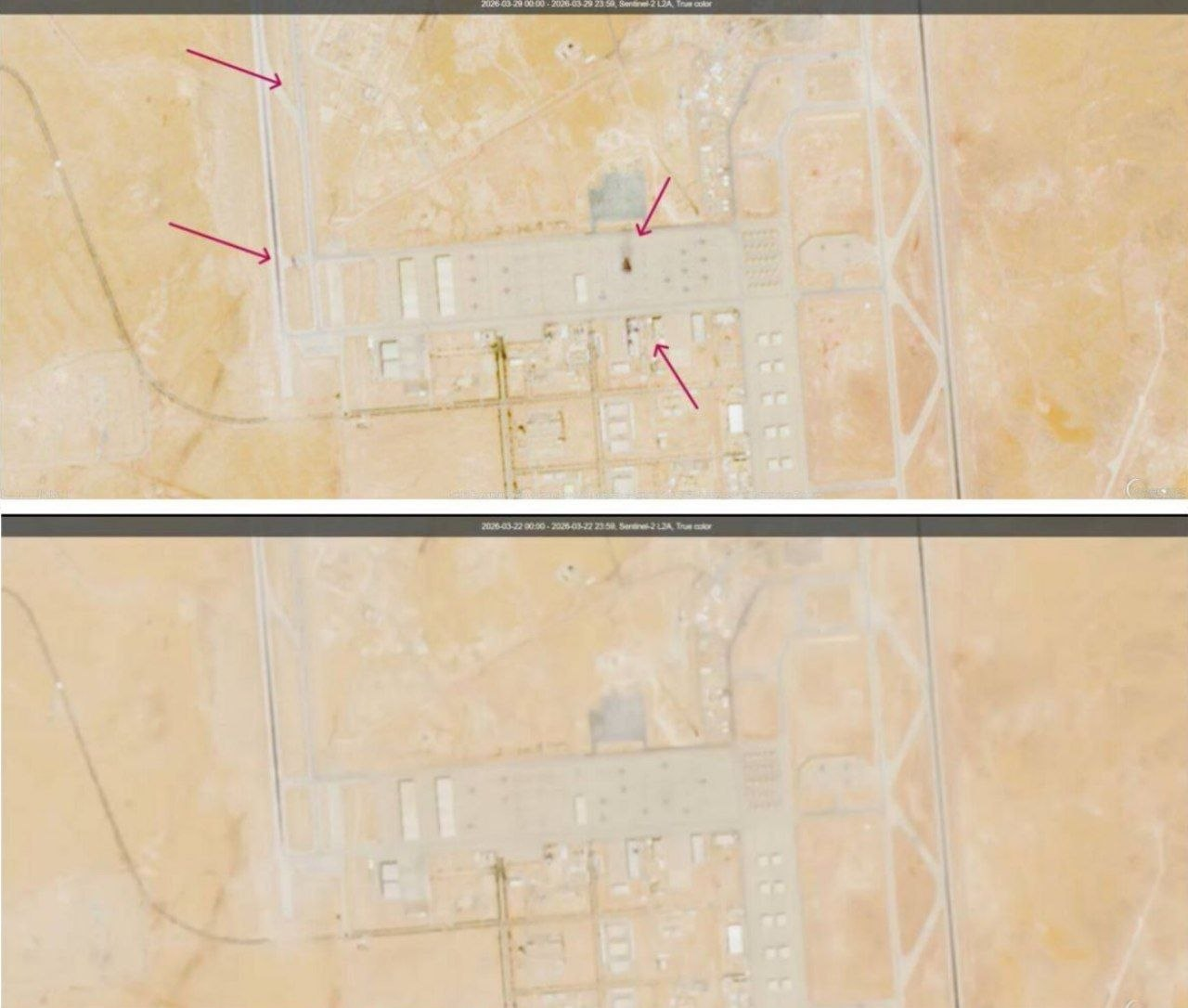 伊朗方面发布打击沙特苏丹王子空军基地相关设施前后卫星对比图