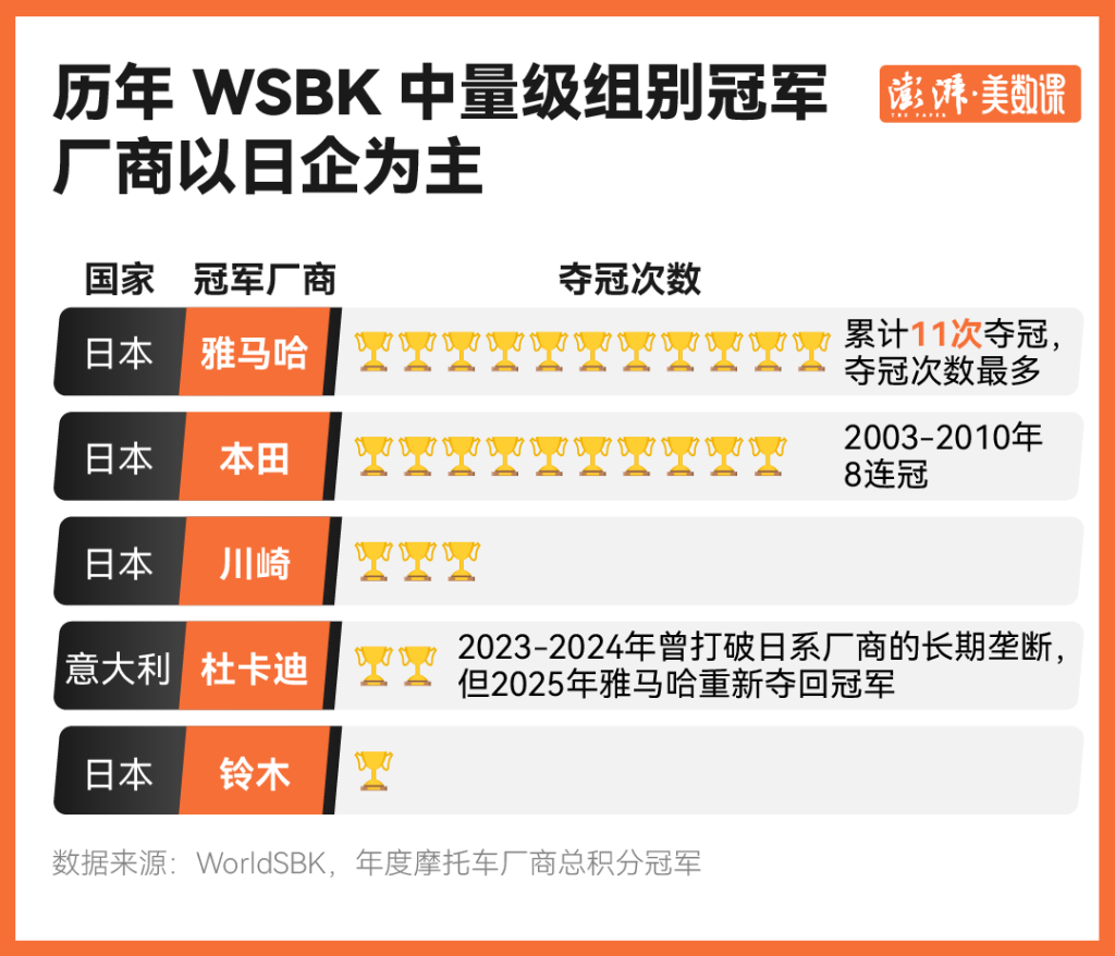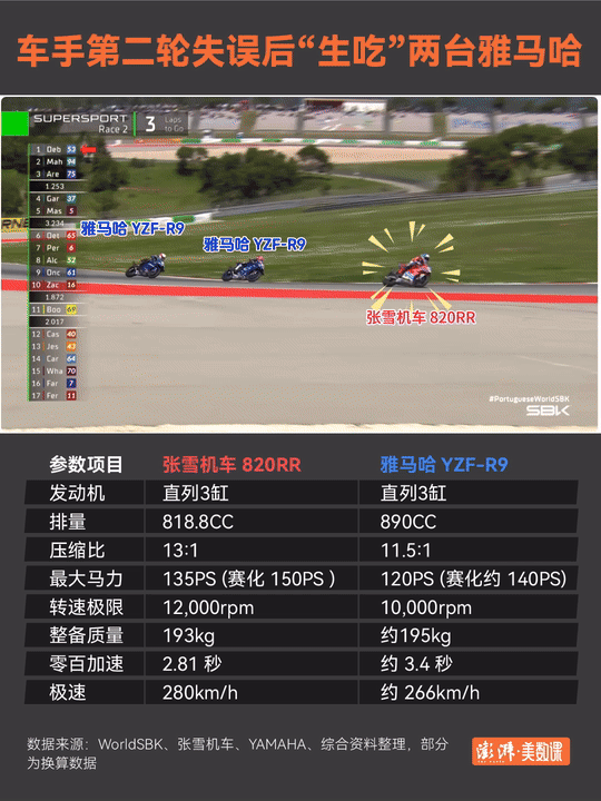 自1988年以来,WSBK中量级组别冠军几乎由雅马哈、本田等日企包揽。今年的比赛将持续到10月,共12场,后续还将转战荷兰、匈牙利、捷克等国家和地区,最终根据车手、制造商积分进行排名,截至目前,德比斯在车手积分榜上位列第三,张雪机车暂未进入制造商积分排行榜。