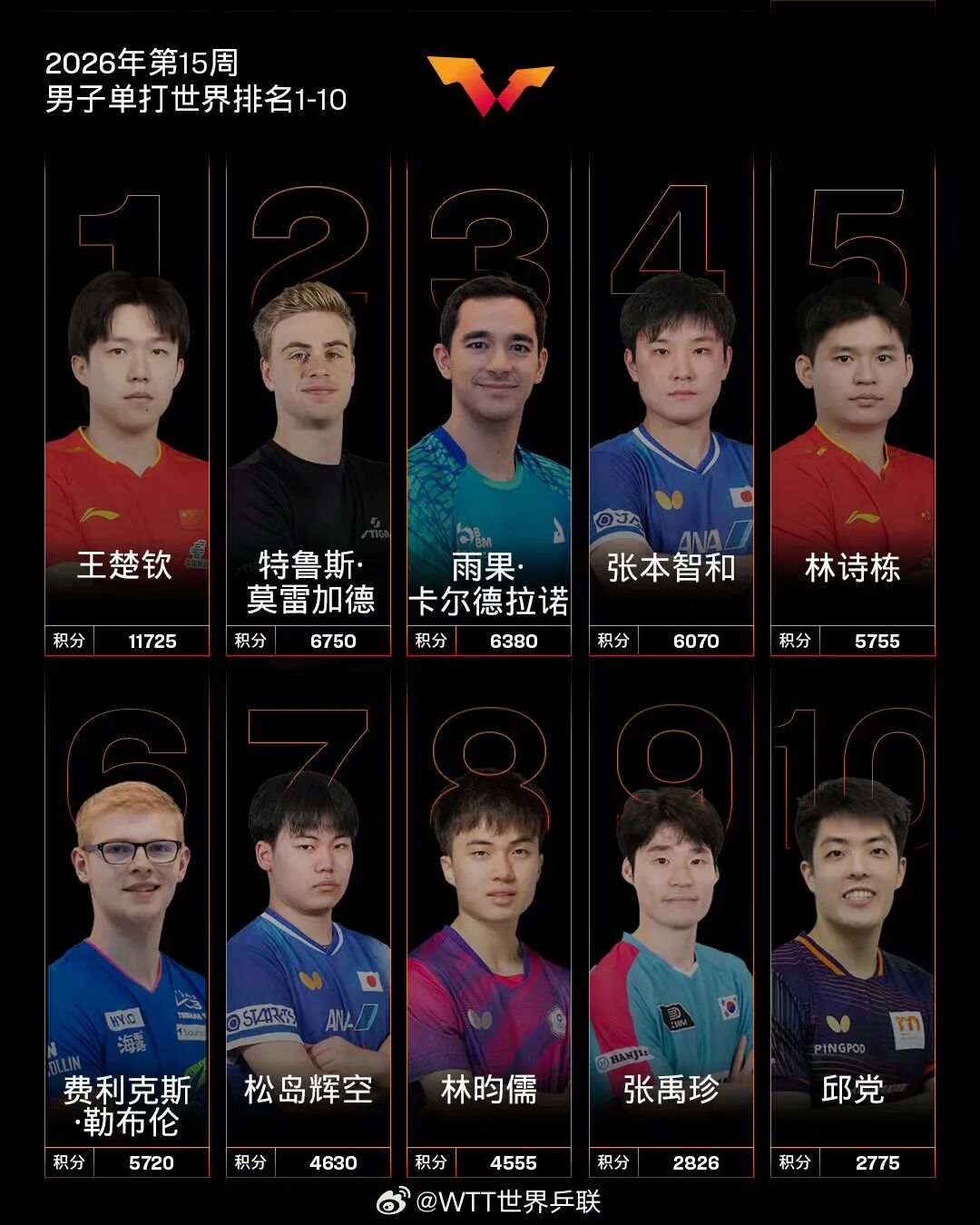 4月6日, @WTT世界乒联 公布国际乒联2026年第15周世界排名。