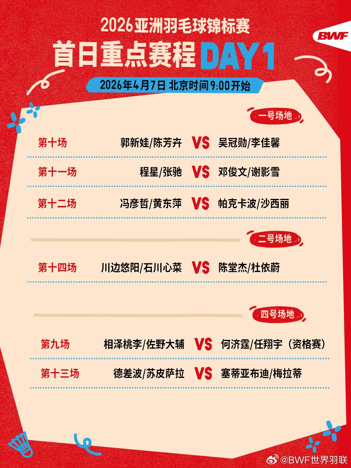 今天(4月7日),2026年亚洲羽毛球锦标赛北京时间9时开打,焦点战:冯彦哲/黄东萍vs帕克卡波/沙西丽、程星/张驰vs邓俊文/谢影雪等。