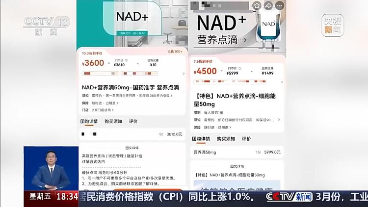 记者在某消费点评网站检索“NAD+营养”相关词条后看到,50毫克的营养点滴有商家售价4500元。“NAD+”被商家赋予了多重功效,号称想打都能打。