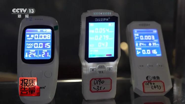 国家家具及室内环境质量检验检测中心工程师张新宇:我们可以看到在不同品牌的便携式甲醛检测仪屏幕上显示值是不一样的,有的显示HCHO(甲醛),有的就是写甲醛。您看这个是0.008,这个是0.03,已经差了40倍了。这是0.6,这个是0.005,现在就差了将近有100倍了。