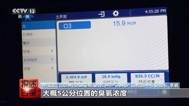 不到十分钟,记者在实验舱外的检测设备上看到,数值显示舱内的臭氧浓度正在迅速上升。根据我国《室内空气质量标准》(GB/T 18883-2022),室内臭氧浓度的小时平均限值为0.16毫克每立方米。而这台除醛仪在运行时,出风口附近的臭氧浓度瞬间就超过了国标限值的90多倍。